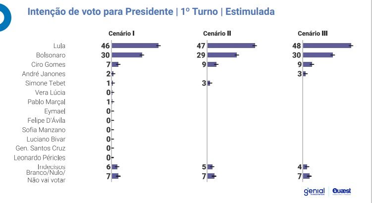 Na pesquisa da Quaest, divulgada pelo banco Genial Investimentos, o ex-presidente Luiz Inácio Lula da Silva (PT) segue na liderança com 46%, contra 30% de Jair Bolsonaro (PL), 7% de Ciro Gomes (PDT), 2% do deputado federal André Janones (Avante), 1% de Simone e Pablo Marçal (PROS). Os demais candidatos – Vera Lúcia (PSTU), Luciano Bivar (União Brasil), Eymael (DC), Sofia Manzano (PCB), General Santos Cruz (Podemos) e Leonardo Péricles (UP) – não pontuaram, enquanto 6% estariam indecisos e 7% votariam em branco ou nulo. (veja aqui)