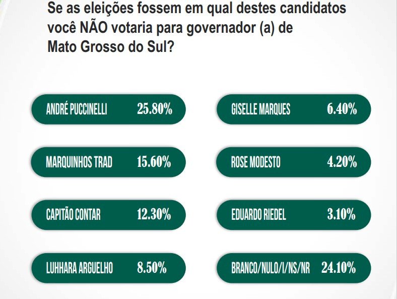 O ex-governador André Puccinelli lidera a taxa de rejeição, mas o índice ficou estável em 25,80%. Já Marquinhos viu o índice cair de 16,2% para 15,6%. A rejeição de Contar é de 12,30%, seguido por Luhhara com 8,5%, Giselle com 6,40%, Rose com 4,2% e Riedel com 4,1%.