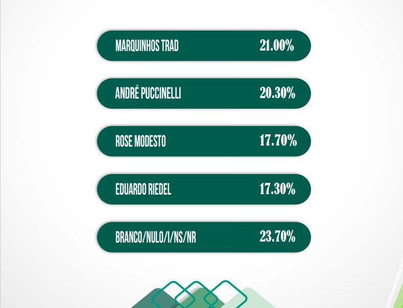 No segundo cenário estimulado, Marquinhos também assumiu a liderança, com 21%, seguido por André com 20,3%, por Rose com 17,7% e Eduardo Riedel com 17,3%. Os candidatos do MDB, União Brasil e PSDB estão empatados tecnicamente. O ex-governador também empata com o ex-prefeito da Capital em primeiro. Brancos, nulos e indecisos seriam de 23,7%.