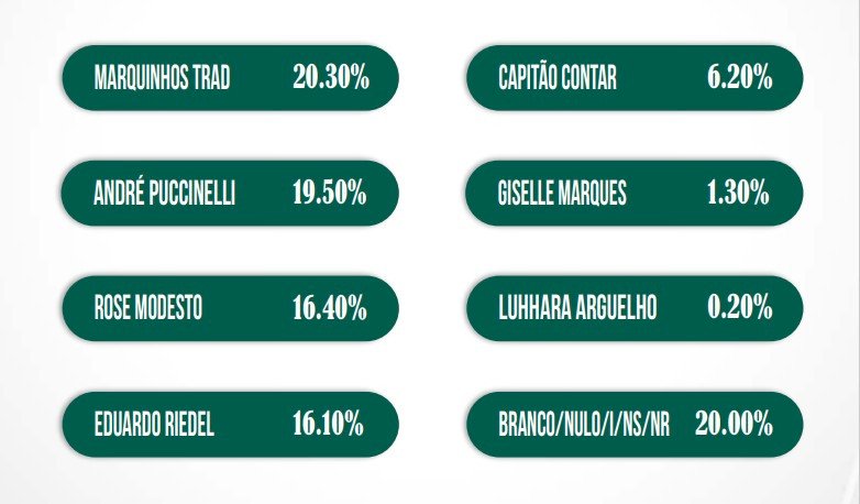 Na estimulada, no primeiro cenário, Marquinhos tem 20,3%, seguido por André com 19,5%, Rose com 16,40%, Riedel com 16,1%, Capitão Contar com 6,2%, Giselle com 1,3% e Luhhara com 0,40%. Os brancos, nulos e indecisos somam 20%.
