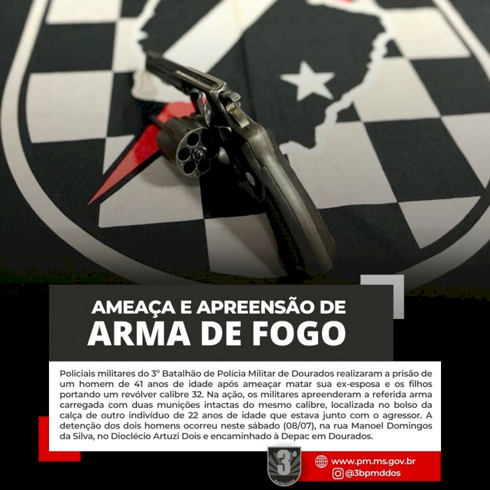 Policiais militares do 3º Batalhão de Polícia Militar de Dourados realizaram a prisão de um homem de 41 anos de idade após ameaçar matar sua ex-esposa e os filhos portando um revólver calibre 32. Na ação, os militares apreenderam a referida arma carregada com duas munições intactas do mesmo calibre, localizada no bolso da calça de outro indivíduo de 22 anos de idade que estava junto com o agressor. A detenção dos dois homens ocorreu neste sábado (08/07), na rua Manoel Domingos da Silva, no Dioclécio Artuzi Dois.