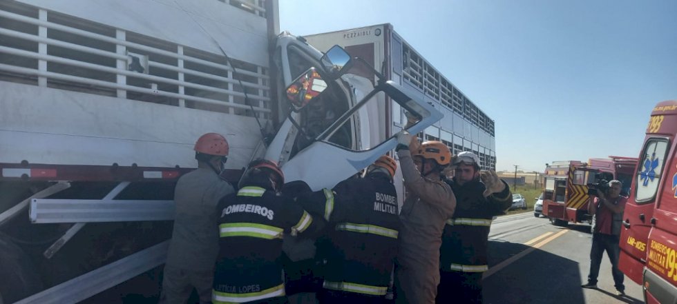 Motoristas ficam presos em ferragens após colisão envolvendo caminhões e carreta