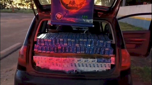 Na segunda ocorrência, por volta das 19h20, a equipe visualizou um Fiat Uno trafegando com visível excesso de peso, sendo possível observar diversas caixas em seu interior, inclusive com a retirada dos bancos. Durante a abordagem, foram apreendidas oito caixas de cigarros eletrônicos, 20 caixas de fumo para narguilé, um volume de essência para vape, duas caixas com brindes diversos e uma caixa de xícaras, todos sem documentação fiscal.