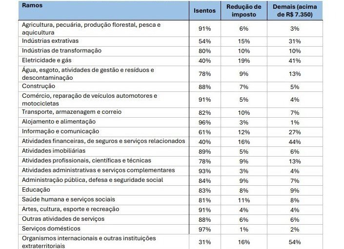 O levantamento do Dieese mostra também em quais setores econômicos estão as pessoas que ganham mais que R$ 5 mil e até R$ 7.350 por mês. Esse grupo já está pagando menos imposto do que pagava antes.