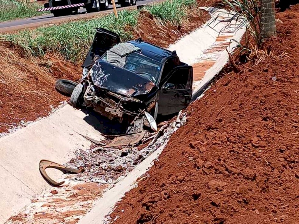 O veículo caiu às margens direita da rodovia, que possui canaletas de concreto, e acabou colidindo frontalmente contra um buraco.