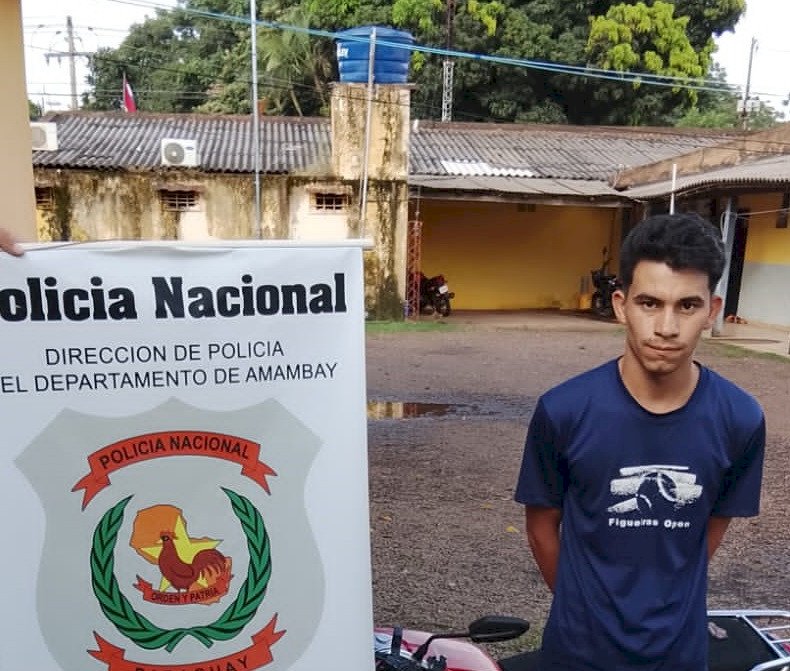 Ladrão identificado como Cesar Andres Gomez Mancuello, de 23 anos, se entregou à policia após ser flagrado furtando uma motocicleta no estacionamento de um atacadista em Pedro Juan Caballero.