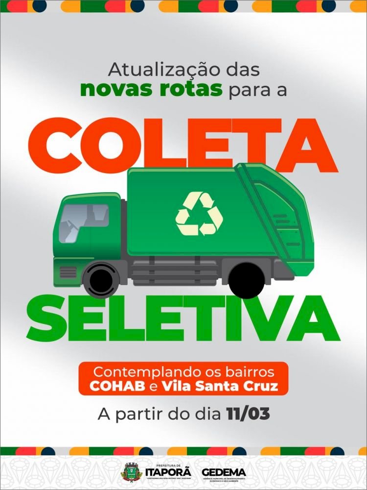 A Prefeitura de Itaporã, por meio da Gerência de Meio Ambiente (GEDEMA), em parceria com a empresa Nova Eng, ampliou as rotas da coleta seletiva no município, fortalecendo as ações voltadas à preservação ambiental e à destinação correta dos resíduos recicláveis.