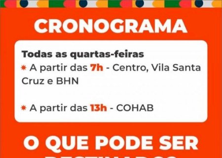 Atualmente, a coleta seletiva é realizada todas as quartas-feiras, a partir das 7 horas da manhã, atendendo os bairros Centro e BNH. Com a ampliação do serviço, a partir do dia 11, o bairro Vila Santa Cruz também passará a ser contemplado no período da manhã.
