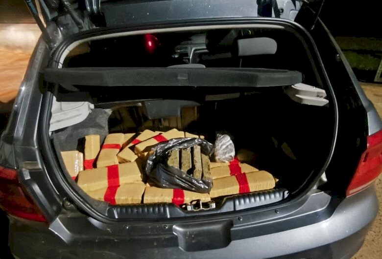 No interior do automóvel, os policiais encontraram 150 tabletes de maconha, totalizando aproximadamente 100,42 quilos da droga. O material estava embalado com fita crepe de cor marrom e apresentava marcação com fita isolante vermelha.