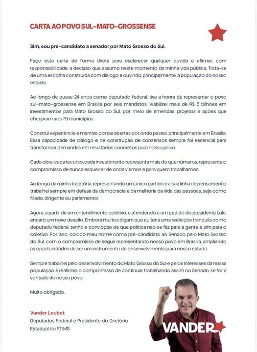 Em uma carta aberta, publicada nas redes sociais, ele afirmou ter tomado a decisão após muito debate. A escolha, segundo Vander, foi tomada após uma construção de responsabilidade. “Ao longo dos 24 anos como deputado federal, tive a honra de representar o povo sul-mato-grossense em Brasília por seis mandatos.Viabilizei mais de R$ 5 bilhões em investimentos para o estado, por meio de emendas, projetos e ações que chegaram aos 79 municípios”, detalhou.