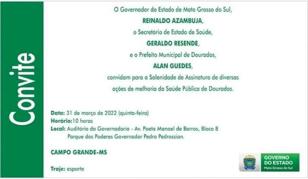 O Governador Reinaldo Azambuja e o Secretário de Estado de Saúde, Geraldo Resende estava preparando uma agenda para amanhã em Dourados para a assinatura do convênio, quando receberam a notícia que o Prefeito Alan Guedes prefere assinar o convênio na Capital, temendo protetos dos professores.