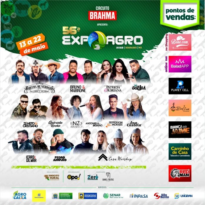 Os shows da 56ª Expoagro em 2022 vão contemplar sertanejo, pop, eletrofunk e gospel. A maior feira de agronegócio de Mato Grosso do Sul acontecerá entre os dias 13 e 22 de maio, totalmente presencial, no Parque de Exposições João Humberto de Andrade Carvalho, em Dourados.