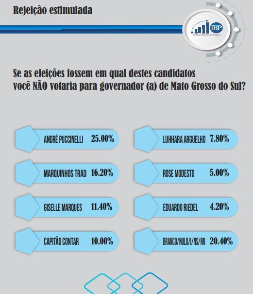 O IBP pesquisou o índice de rejeição dos candidatos. André é o mais rejeitado, com 25%, seguido por Marquinhos com 16,2%, Giselle com 11,4%, Contar com 10%, Luhara com 7,8%, Rose com 5% e Eduardo Riedel com 4,2%. 20% dos eleitores não rejeitam nenhum dos candidatos ou preferiram não responder.