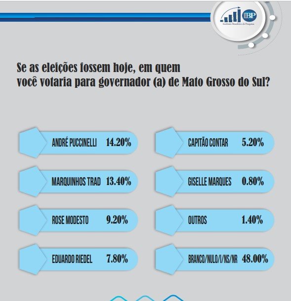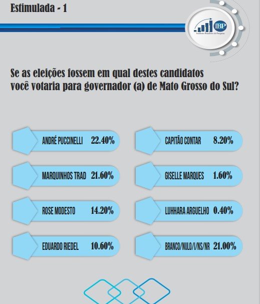 O ex-governador André Puccinelli (MDB) e o ex-prefeito de Campo Grande, Marquinhos Trad (PSD), estão empatando tecnicamente, com ligeira vantagem do emedebista, na primeira pesquisa do IBP (Instituto Brasileiro de Pesquisa), divulgada com exclusividade pelo O Jacaré. O ex-secretário estadual de Infraestrutura, Eduardo Riedel (PSDB), está em 4º, mas em empate técnico com o deputado estadual Capitão Contar (PRTB).