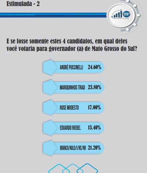 Rose ficou em terceiro lugar, com 14,2%, enquanto Riedel fica com 10,6%, Capitão Contar com 8,2%, Giselle Marques com 1,6% e Luhara com 0,40%. Conforme a pesquisa, brancos, nulos e indecisos somam 21%. O percentual é alto e mostra que um quinto dos eleitores sul-mato-grossense ainda não decidiram em quem vão votar para governador.