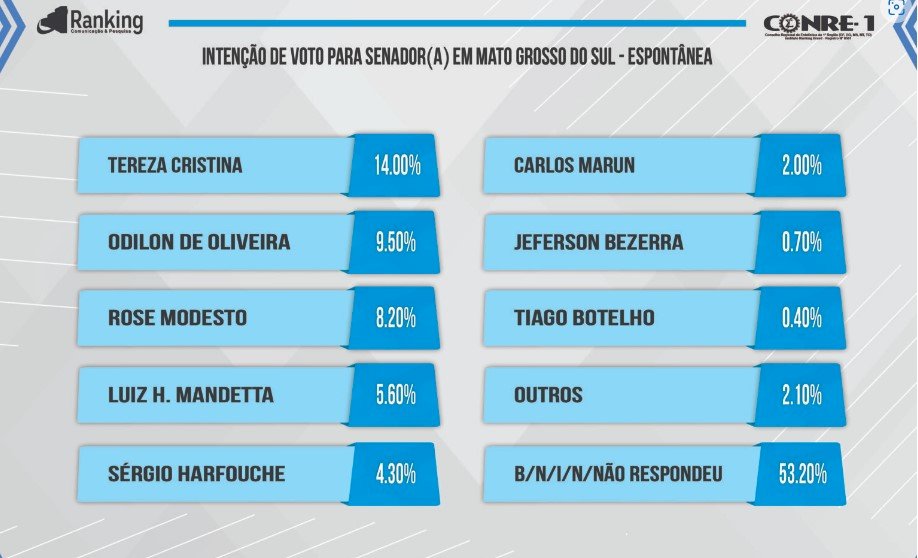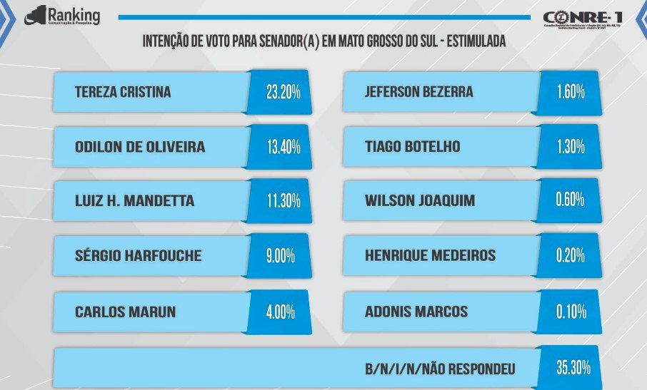 Conforme o Ranking, Tereza tem 23,20% e lidera isolada a pesquisa, seguida pelo juiz Odilon com 13,40%, pelo ex-ministro da Saúde, Luiz Henrique Mandetta (União Brasil), com 11,30%, pelo procurador de Justiça Sérgio Harfouche (Avante) com 9%, pelo ex-ministro da Secretaria de Governo, Carlos Marun (MDB), 4%, pelo empresário Jeferson Bezerra (Agir 35) com 1,60%, Tiago Botelho com 1,30%, por Wilson Joaquim com 0,60%, pelo publicitário Henrique Medeiros (PV) com 0,20% e por Adonis Marcos 0,10%. Indecisos, nulos e brancos somam 35,30%.