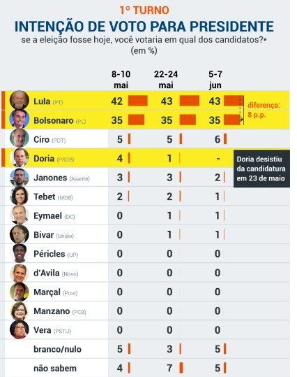 De acordo com o PoderData, Lula permanece com 43% e Bolsonaro com 35%. Ciro oscilou de 5% para 6%. Janones passou de 3% para 2%, enquanto Simone variou de 2% para 1%. Eymael e Bivar possuem 1%. Indecisos somam 5%, mesmo percentual de votos nulos e brancos.