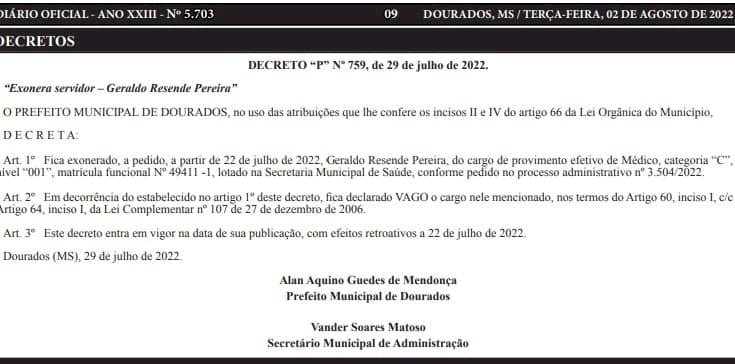Conforme o decreto do prefeito Alan Guedes (PP), publicado no Diário Oficial da última terça-feira (2), Pereira foi exonerado, a pedido, com data retroativa ao dia 22 de julho deste ano. O progressista assinou o decreto no dia 29 de julho deste ano.