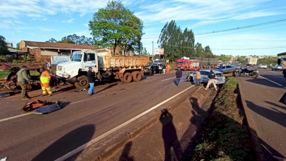 Acidente na manhã desta sexta-feira (19), envolvendo cinco veículos sendo um Gol prata, Corsa prata, caminhão caçamba, Ford Fiesta preto e Fiat Pálio vermelho, deixou dois feridos na BR-163, entre o Trevo do DOF e do Bandeira, em Dourados.