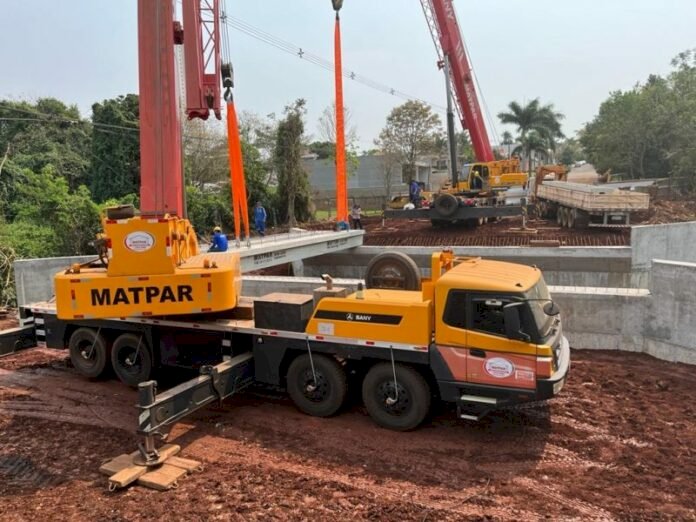 Nesta etapa da obra, o trabalho é feito com dois caminhões guindastes que levantam até 80 toneladas, um em cada lado, para que os módulos da laje sejam posicionados. “Os dois trabalham em sincronia para que os módulos possam ser posicionados, um a um. Esse processo é feito com todo cuidado, mas dentro do planejado”, explica João Vítor Antônio, engenheiro da Matpar, empresa responsável pela obra.