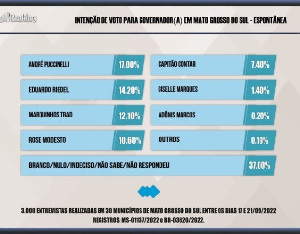 Se as eleições fossem hoje, segundo repercute o site DiárioMS News, o segundo turno das eleições em Mato Grosso do Sul seria disputado entre o candidato do MDB, André Puccinelli e o do PSDB, Eduardo Riedel. Na quarta posição vem Rose Modesto (União Brasil), depois Capitão Contar (PRTB) e na sequência, Giselle Marques (PT), Adônis Marcos (Rede/PSOL) e Magno Souza (PCO).