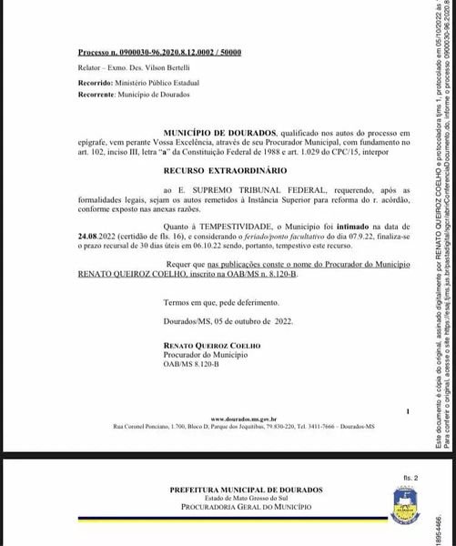 Na última quarta-feira (05), a Prefeitura Municipal de Dourados entrou com recurso extraordinário no Tribunal de Justiça do Mato Grosso do Sul (TJ-MS) sobre a convocação dos remanescentes da Guarda Municipal que haviam sido aprovados no concurso do município, porém até o presente momento não foram chamados a compor os quadros da guarda. Nas instâncias anteriores a Prefeitura havia perdido, inclusive no TJ-MS, no entanto em incansáveis recursos, a Prefeitura insiste em não chamar os servidores.