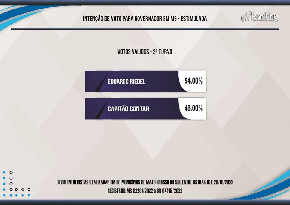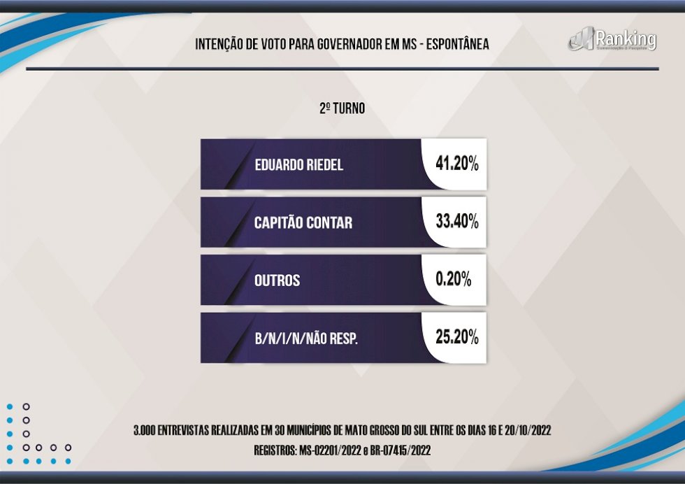 3.000 entrevistas realizadas em 30 municípios do MS entre os dias 16 e 20 de outubro de 2022. Registros: MS-02201/2022 e BR-07415/2022. A pesquisa foi encomendada pelo site MGS NEWS. O Instituto Ranking Brasil é registrado no Conre 1 com o número: 8561. Intervalo de confiança de 95%. A margem de erro máxima estimada foi de 1,8 pontos percentuais, para mais ou para menos.