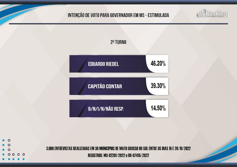 Novo levantamento de dados do Instituto Ranking Brasil divulgado nesta sexta-feira (21/10/22), aponta que o candidato do PSDB, Eduardo Riedel, tem 46,20% dos votos na pesquisa estimulada em Mato Grosso do Sul. Já o candidato do PRTB, Capitão aposentado Renan Contar, tem 39,30% de intenção de votos no segundo turno. Brancos, nulos, indecisos e os que não sabem ou não responderam somam 14,50%.