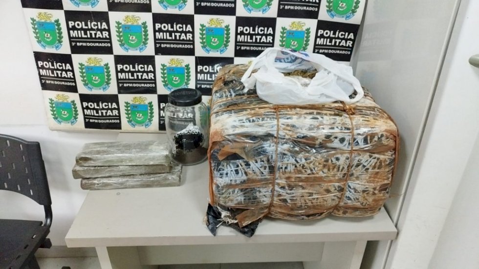 Na vistoria veicular, a PM encontrou aproximadamente 26 quilos de substancia análoga a Skank. O dono do carro assumiu a propriedade da droga e informou tê-la adquirido nas proximidades do Rio Dourados por R$ 1 mil.