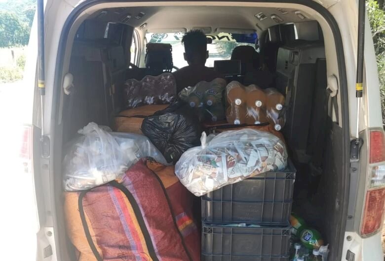 Foi pedido para o mesmo abrir a porta traseira do veículo, e então foi encontrado no interior dos veículos diversas mercadorias, tais como bebidas: doces, cereais, brinquedos, 36 kg de folhas de coca in natura e 3,5 kg de lichia in natura.
