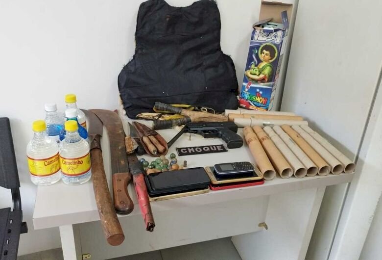 Policiais militares do Choque e da Força Tática apreenderam arma de fogo calibre 22, facas e facões, além de diversos rojões em posse de grupo.