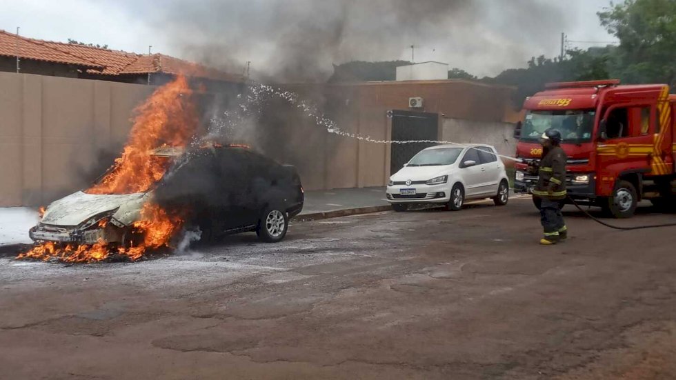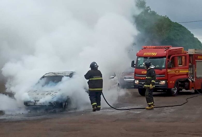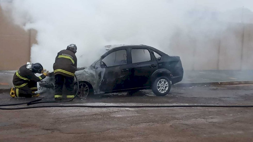 Incêndio destruiu um Ford Fiesta na manhã desta segunda-feira (17/4) na rua Ciro Melo, próximo ao cruzamento com a rua Aquidauana, na região da Vila Lili, em Dourados.