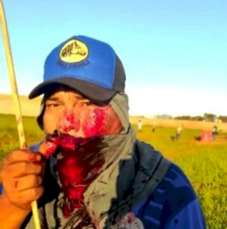 Com sangue no rosto, um indígena afirma que levou tiro. “Ele atirou primeiro. Nós fomos chegando para conversar e ele já chegou atirando”, diz, referindo-se aos policiais.