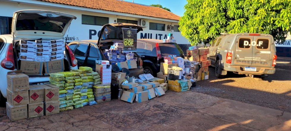 Os policiais faziam policiamento na zona rural do município quando abordaram o comboio. Nos veículos Ford/Fiesta, GM/Astra e Fiat/Palio foram apreendidos diversos pacotes de cigarros, cadeados, relógios, isqueiros, cigarros eletrônicos, rádios comunicadores, repetidores de Wi-Fi, processadores, autos falantes e pneus avaliados em aproximadamente R$ 420 mil.