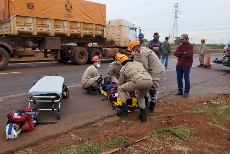 Acidente provocado supostamente pela condutora de uma moto Honda Biz envolveu três caminhões na tarde desta terça-feira (18) na BR-163 em Dourados. Evanildo Munhos, 45, motorista de um dos caminhões, foi socorrido pelo Corpo de Bombeiros em estado grave.
