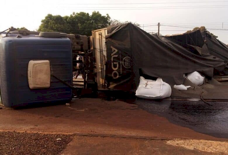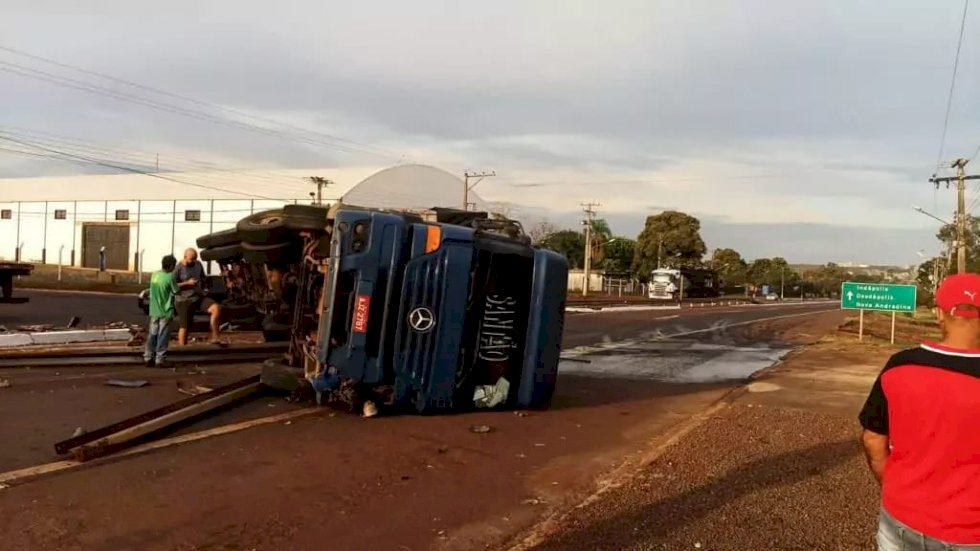 Uma carreta que transportava combustível tombou por volta das 7h20 desta quinta-feira (27/7), na BR-163, no distrito Vila São Pedro, em Dourados.