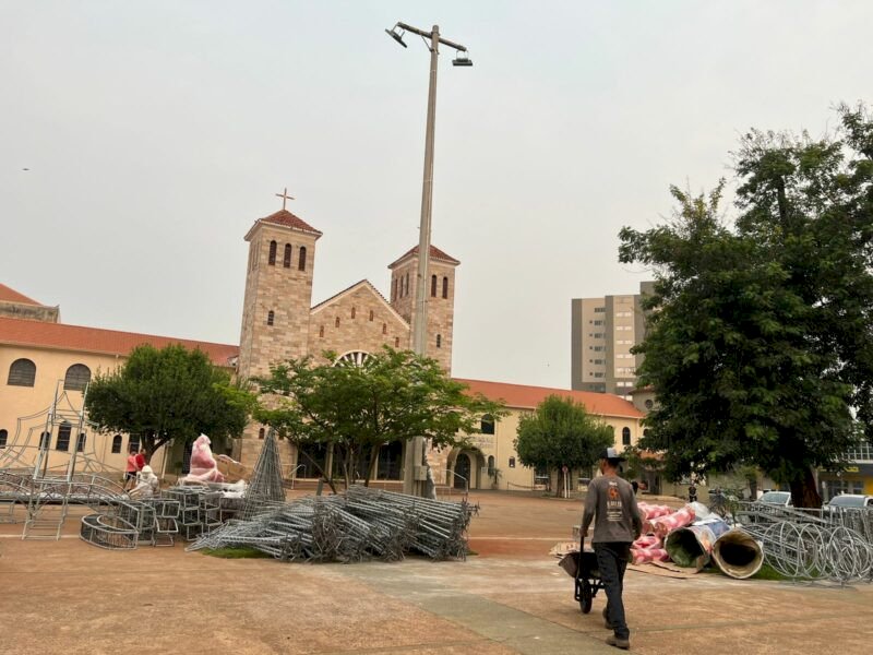 Decoração do Dourados Brilha começa a ser instalada na praça