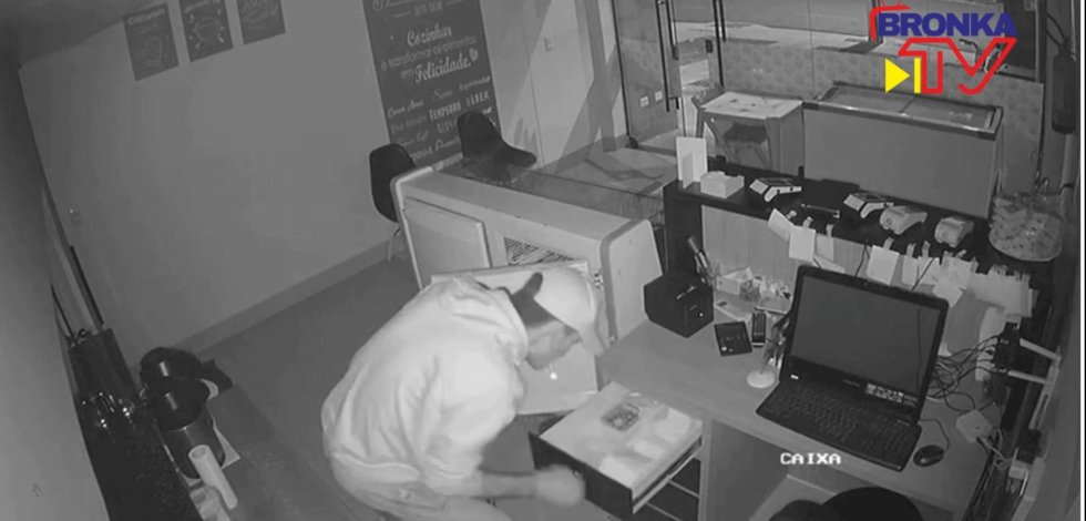 Nas imagens é possível ver quando ele chega ao local, danifica a porta, entra e com uma mochila se dirige até onde está o dinheiro. O ladrão percebe que há câmeras, porém, não se intimida (veja o vídeo acima).