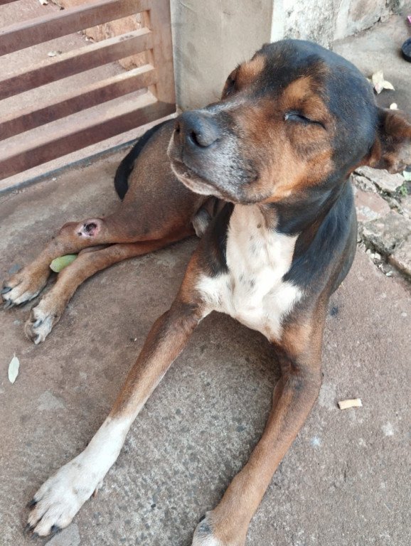Os policiais foram até o endereço informado e constataram a situação. No local, foi encontrado um cão macho adulto, sem raça definida, apresentando grave ferimento em uma das pernas, impossibilitado de se locomover, além de sinais evidentes de desnutrição e infestação por carrapatos.