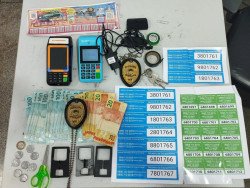 As diligências prosseguiram até o hotel onde o suspeito estava hospedado. No quarto, foram apreendidos outros três dispositivos “chupa-cabra”, duas máquinas de cartão, R$ 2 mil em espécie e adesivos falsos com números de “suporte técnico”, usados para induzir as vítimas a fornecerem informações sensíveis, permitindo a consumação dos golpes.