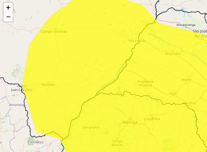 Dourados e mais 54 cidades (veja a lista abaixo), estão em alerta amarelo, que indica perigo potencial, para ventos que podem variar entre 40km/h a 60km/h, válidos entre esta quinta-feira (25/9) até as 23h59 de sexta (26/9), segundo divulgou o Inmet (Instituo Nacional de Meteorologia).