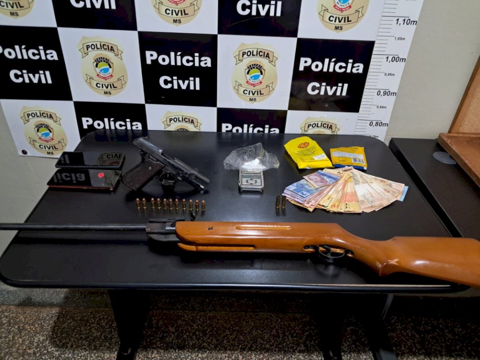 A PC (Polícia Civil) de Itaporã deflagrou nesta quinta-feira (25/9), operação para o cumprimento de mandado de busca e apreensão na residência de dois investigados, e apreendeu arma de fogo, munições, drogas, cigarros eletrônicos e cigarros de origem estrangeira. Um dos alvos foi preso em flagrante. A ordem judicial foi cumprida com apoio da PM (Polícia Militar).