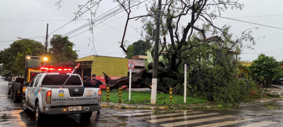 As rajadas de vento registradas na tarde desta sexta-feira (12/12), provocaram diversos estragos em várias regiões de Dourados. No cruzamento da Avenida Joaquim Teixeira Alves com a Rua Barão do Rio Branco, uma árvore de grande porte caiu e atingiu a parte dianteira de um carro, além de derrubar o muro de uma residência.