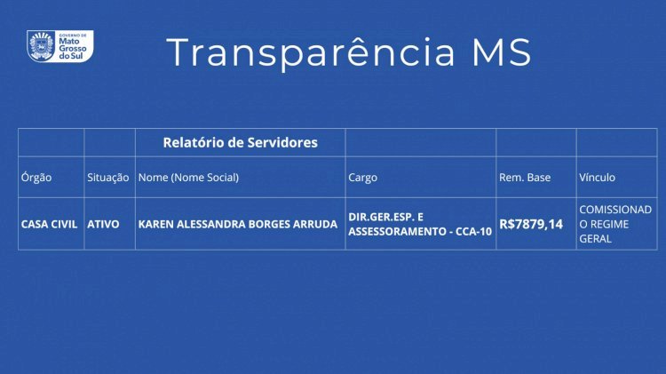 Dados do Portal da Transparência mostram que Karen Alessandra é servidora pública estadual, com lotação em Campo Grande, e recebe salário mensal de R$ 7.879,14. Apesar disso, ela teria passado os últimos meses vivendo em Ivinhema, cidade a quase 300 quilômetros da Capital.