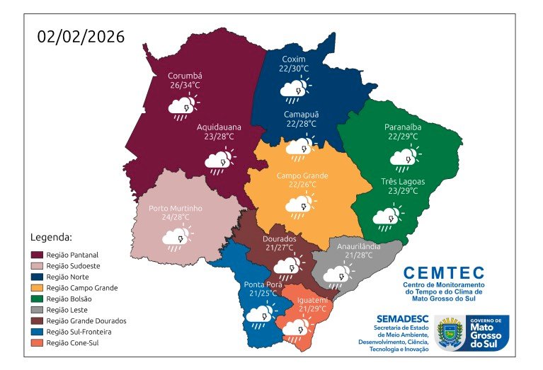 A previsão do tempo para esta segunda-feira (2) indica um cenário de tempo instável em praticamente todo o Mato Grosso do Sul, conforme o mapa divulgado pelo Cemtec (Centro de Monitoramento do Tempo e do Clima). A instabilidade atmosférica passa a estar mais associada à formação e atuação de um sistema de baixa pressão entre o Paraguai, a Bolívia e o território sul-mato-grossense, reforçando a ocorrência de chuvas frequentes e, em alguns pontos, intensas.