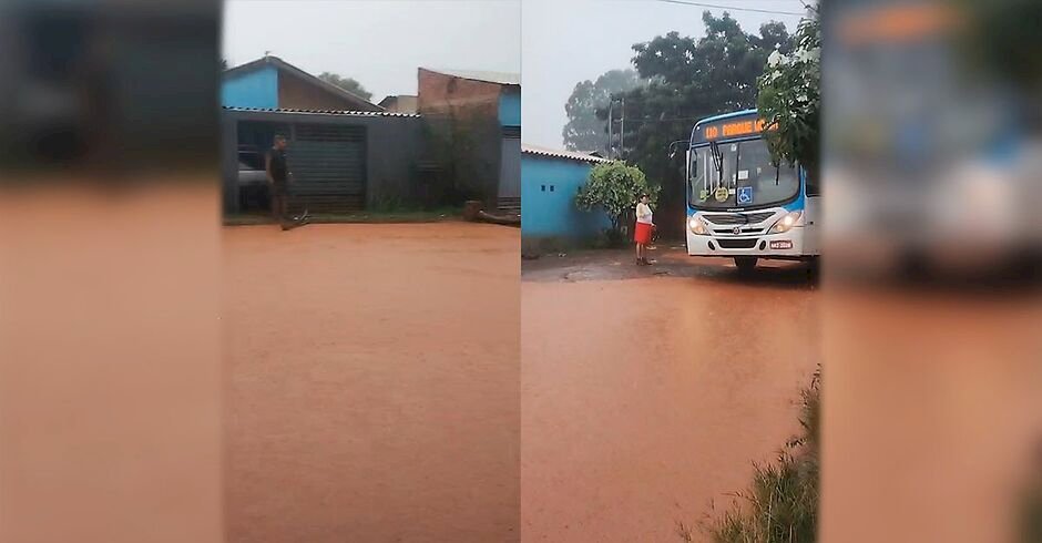 Vídeo enviado pela leitora mostra o momento em que uma moradora, desesperada, implora para que o motorista de um ônibus não siga pela rua alagada. “Aqui não tem mais condições de passar. Quando o ônibus passa, a água entra tudo dentro da minha casa”, diz a mulher nas imagens.