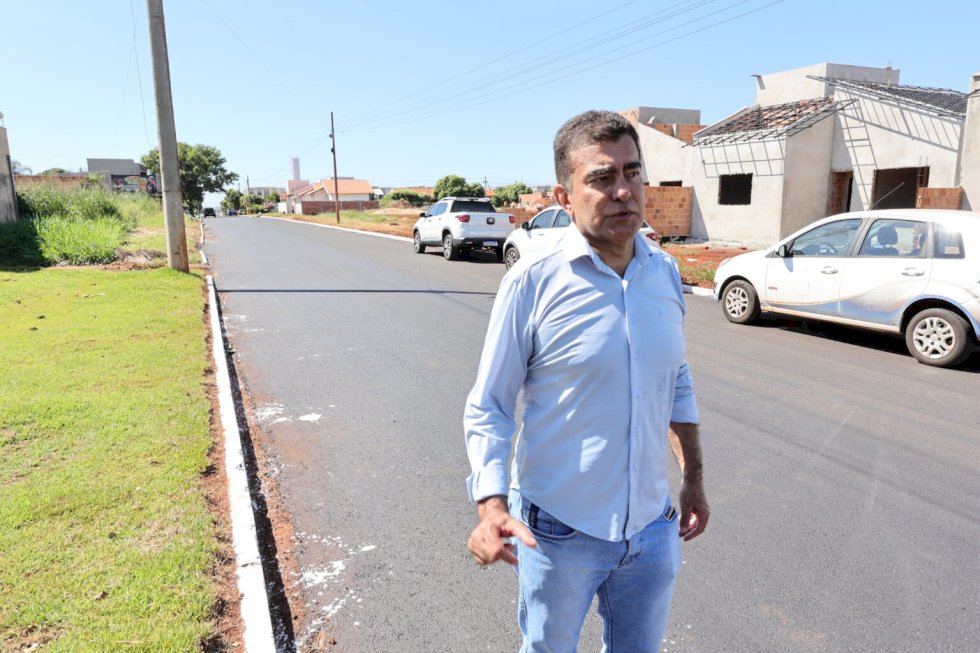 Rua Takao Massago recebe novo pavimento em trecho após vistoria do prefeito Marçal Filho; quadrilátero da região também passa por operação tapa-buraco, com as frentes de obras trabalhando para garantir a mobilidade e segurança no trânsito