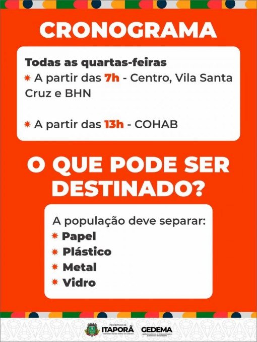 Já no período da tarde, a partir das 13 horas, o bairro COHAB também passará a integrar a rota da coleta seletiva, ampliando o alcance da iniciativa e possibilitando que mais moradores participem do processo de separação e destinação adequada dos materiais recicláveis.