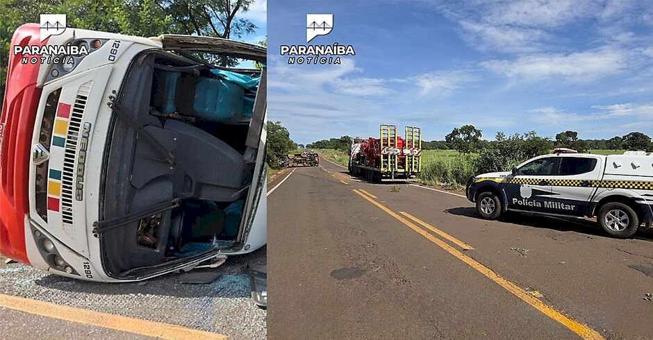 Ônibus bate em carreta parada e tomba em Paranaíba; motorista precisou ser socorrido
