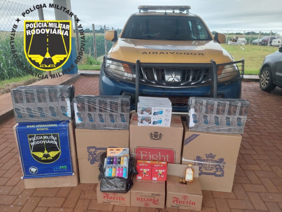 A ação ocorreu no quilômetro um, quando os policiais abordaram o carro e durante revista, encontraram pacotes de cigarros, bebidas alcoólicas e isqueiros. Os ocupantes relataram que haviam adquirido os produtos no Paraguai.